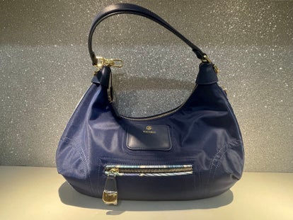 Borsa a spalla Gattinoni in tessuto blu con dettagli multicolor.