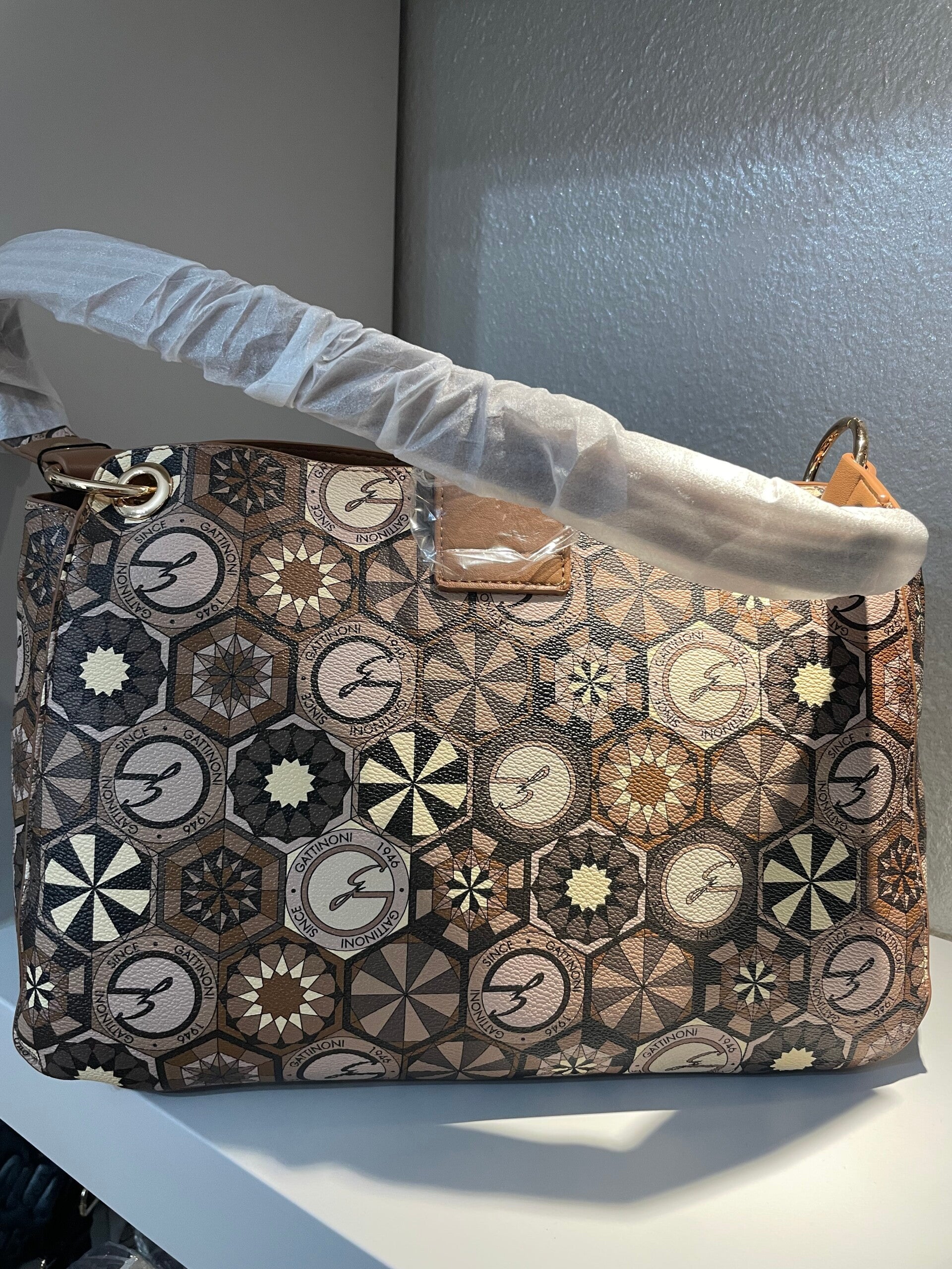 - Fantasia geometrica e monogram.- Dettagli in pelle.- Chiusura a scatto.