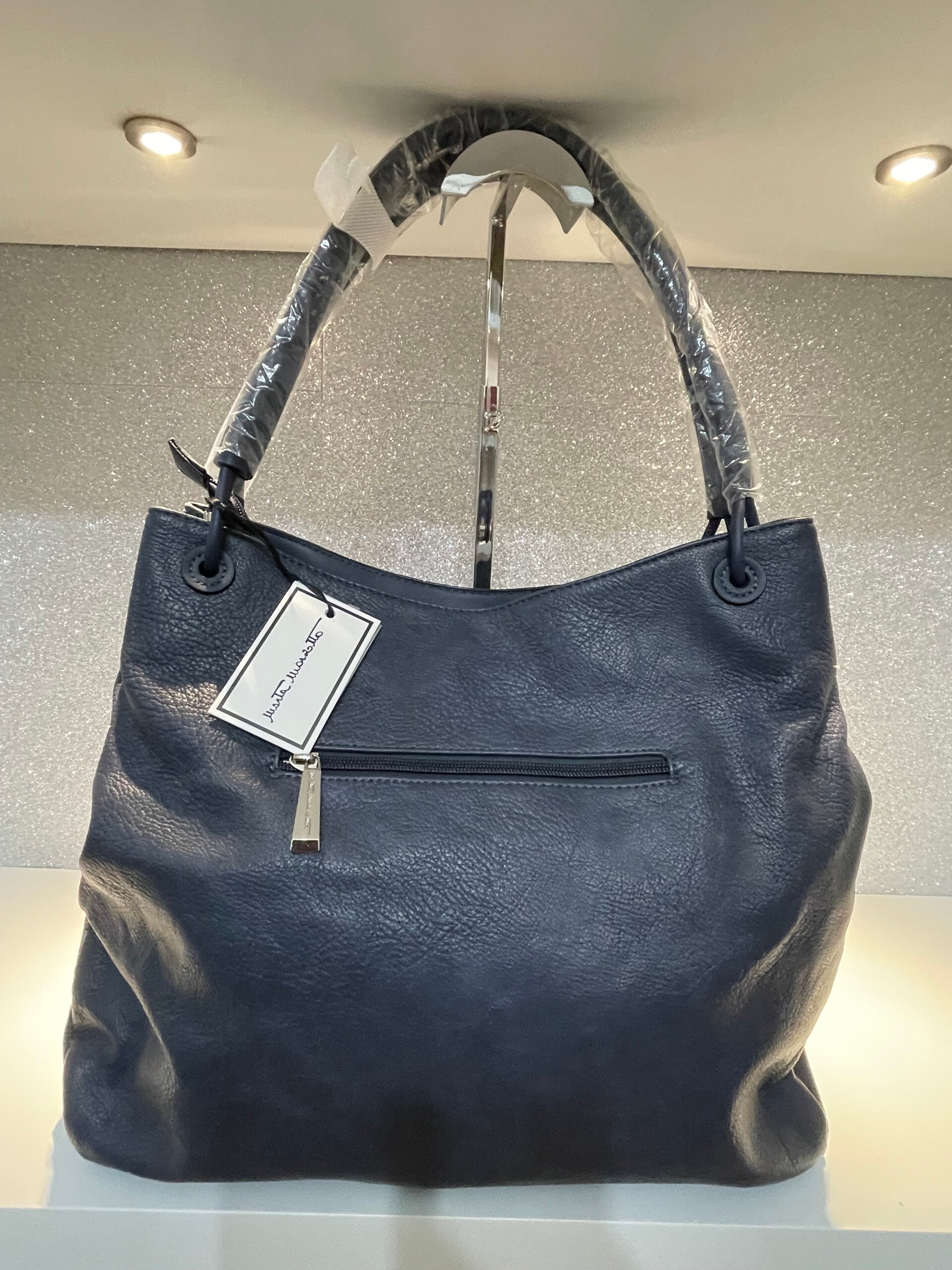 - Materiale similpelle effetto martellato.- Manici morbidi.- Logo dorato applicato sul fronte.