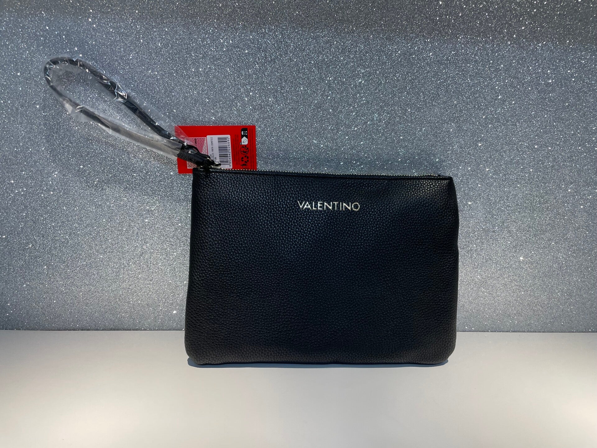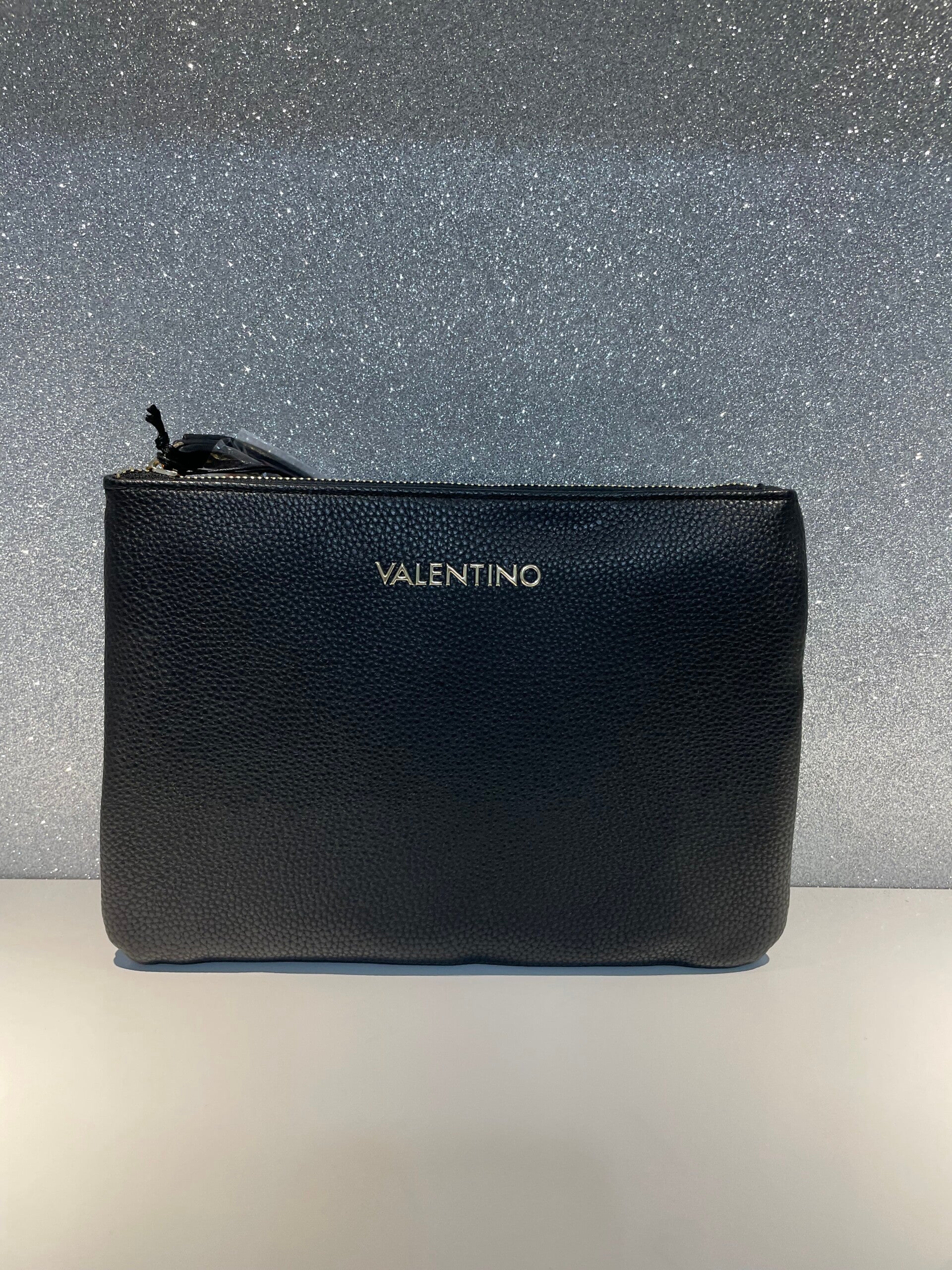 Elegante pochette Valentino in pelle sintetica nera/taupe.